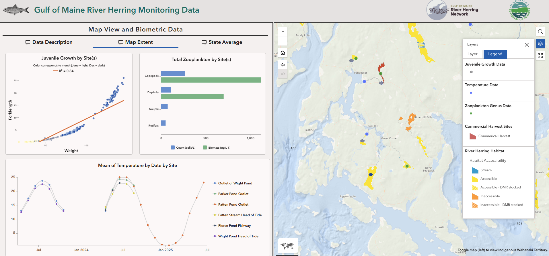 This interactive platform hosts temperature, zooplankton, and juvenile length/weight data from sites across Maine. These data were collected by members of the GOM River Herring Network.