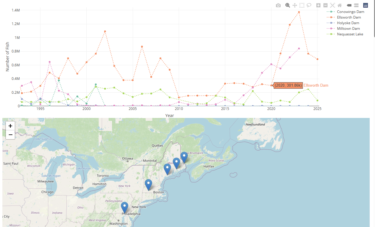 This interactive platform hosts adult return data from river herring and shad runs across the East Coast. It is not intended to be comprehensive, and many runs are not included. Anyone with data is invited to upload it to the platform on the “Upload Data” tab.