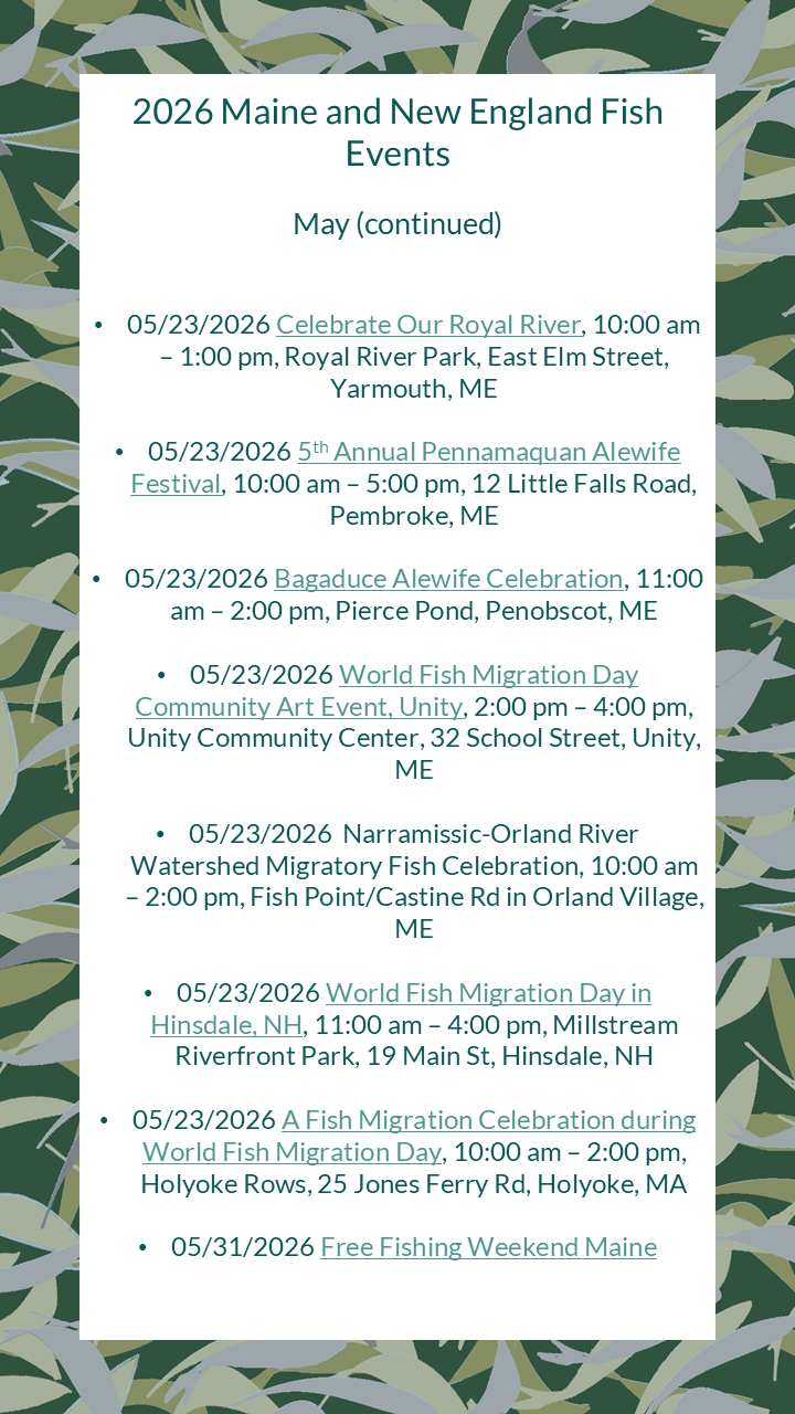 05/23/2026 Narramissic-Orland River Watershed Migratory Fish Celebration, 10:00 am – 2:00 pm, Fish Point/Castine Rd in Orland Village, ME
